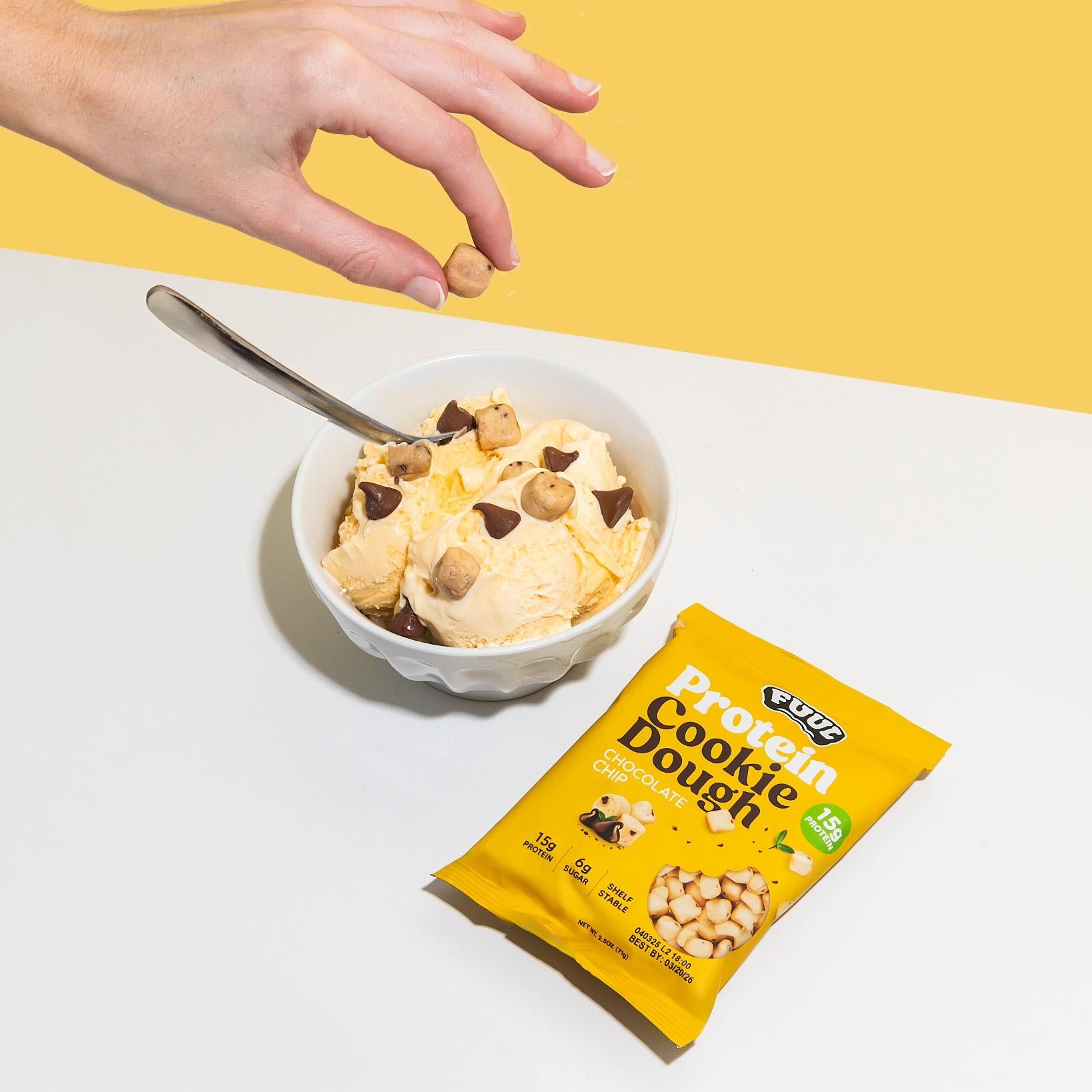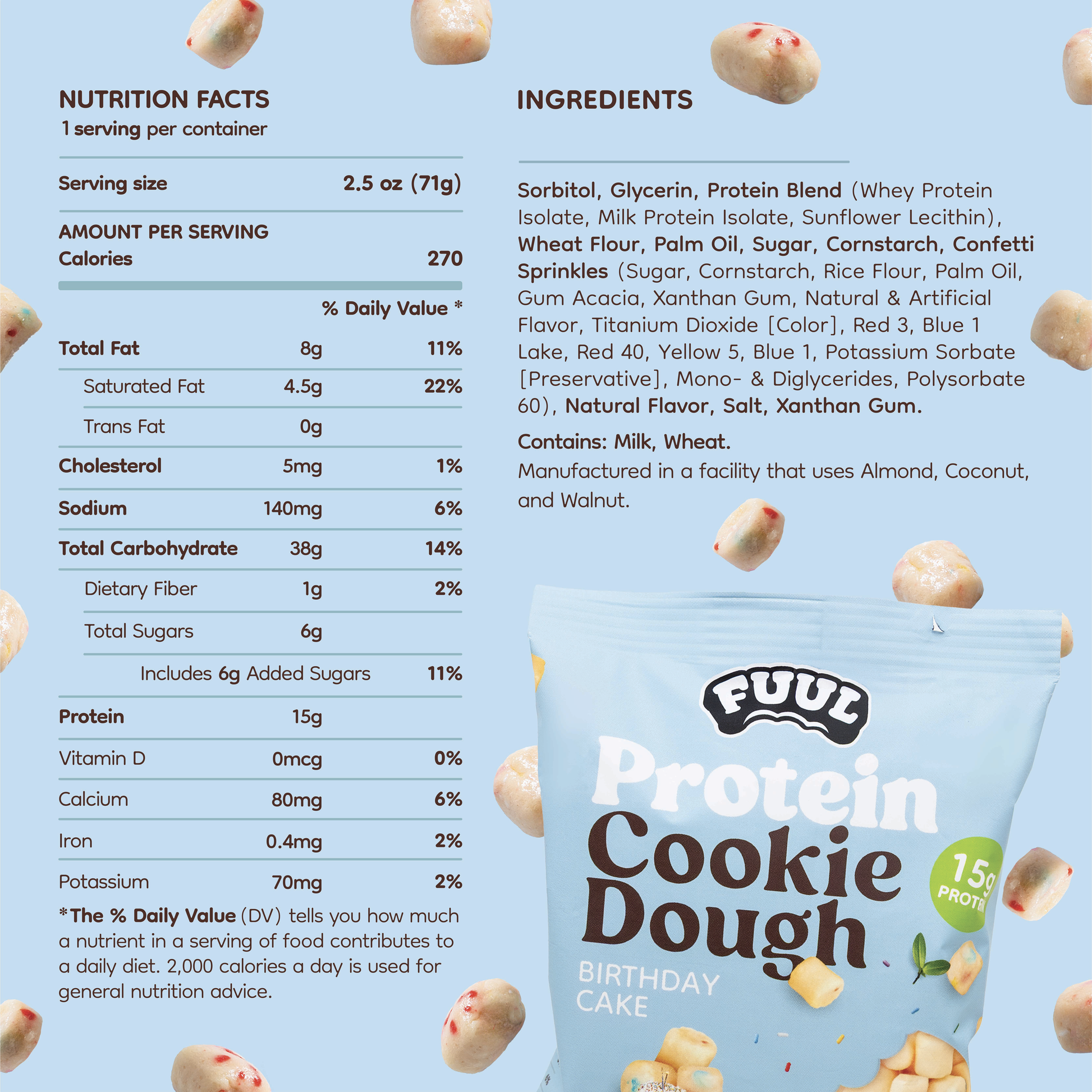 Each 2.5 oz bag of FUUL Protein Cookie Dough contains 15 grams of protein, 6 grams of sugar, and 270 calories.