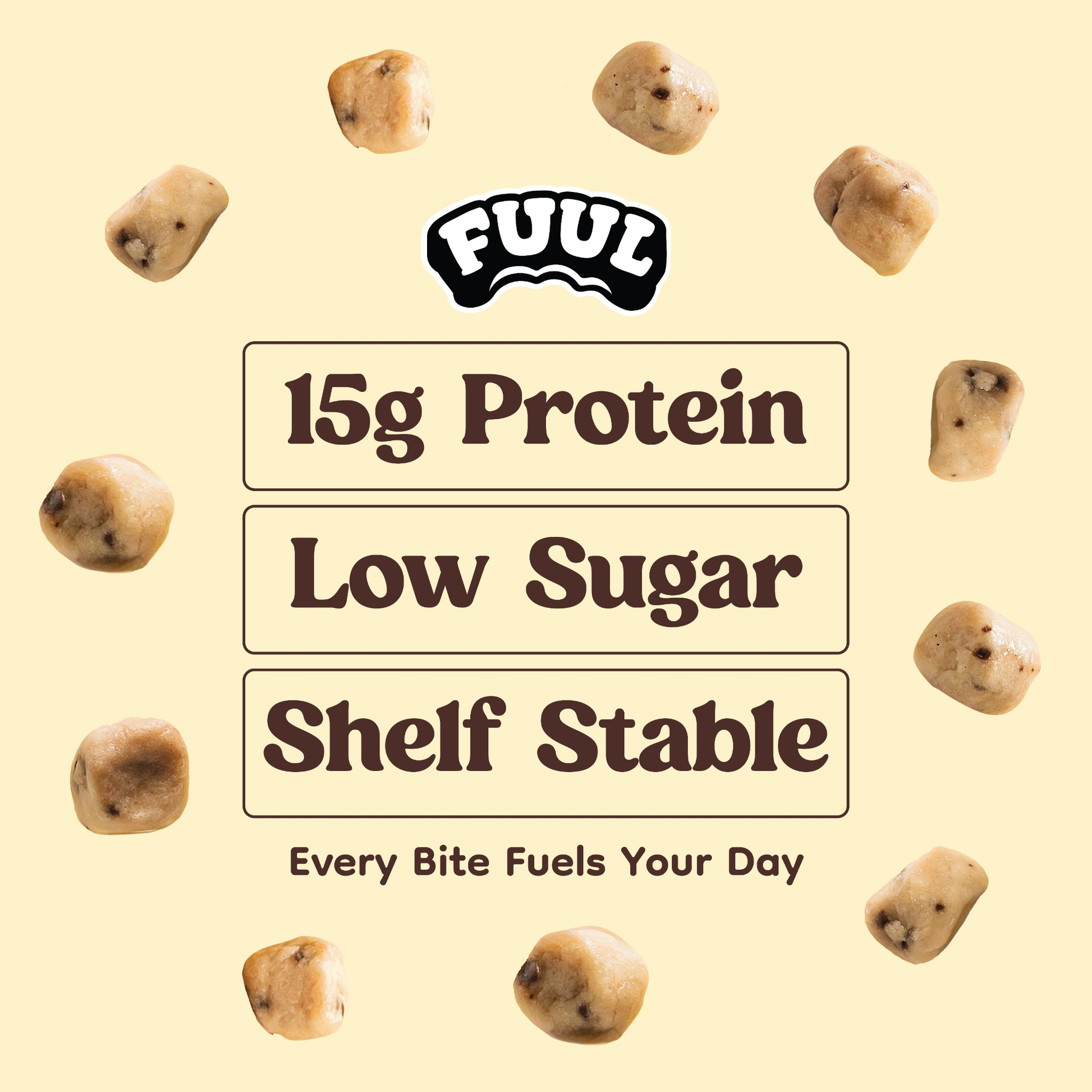 Each 2.5 oz bag of FUUL Protein Cookie Dough contains 15 grams of protein, 6 grams of sugar, and 270 calories.